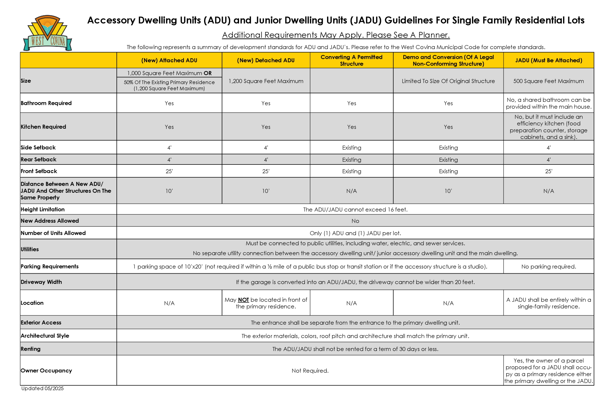 - ADU's and JADU's within the City of West Covina are not allowed to have second addresses or separate utilities from the main residence.