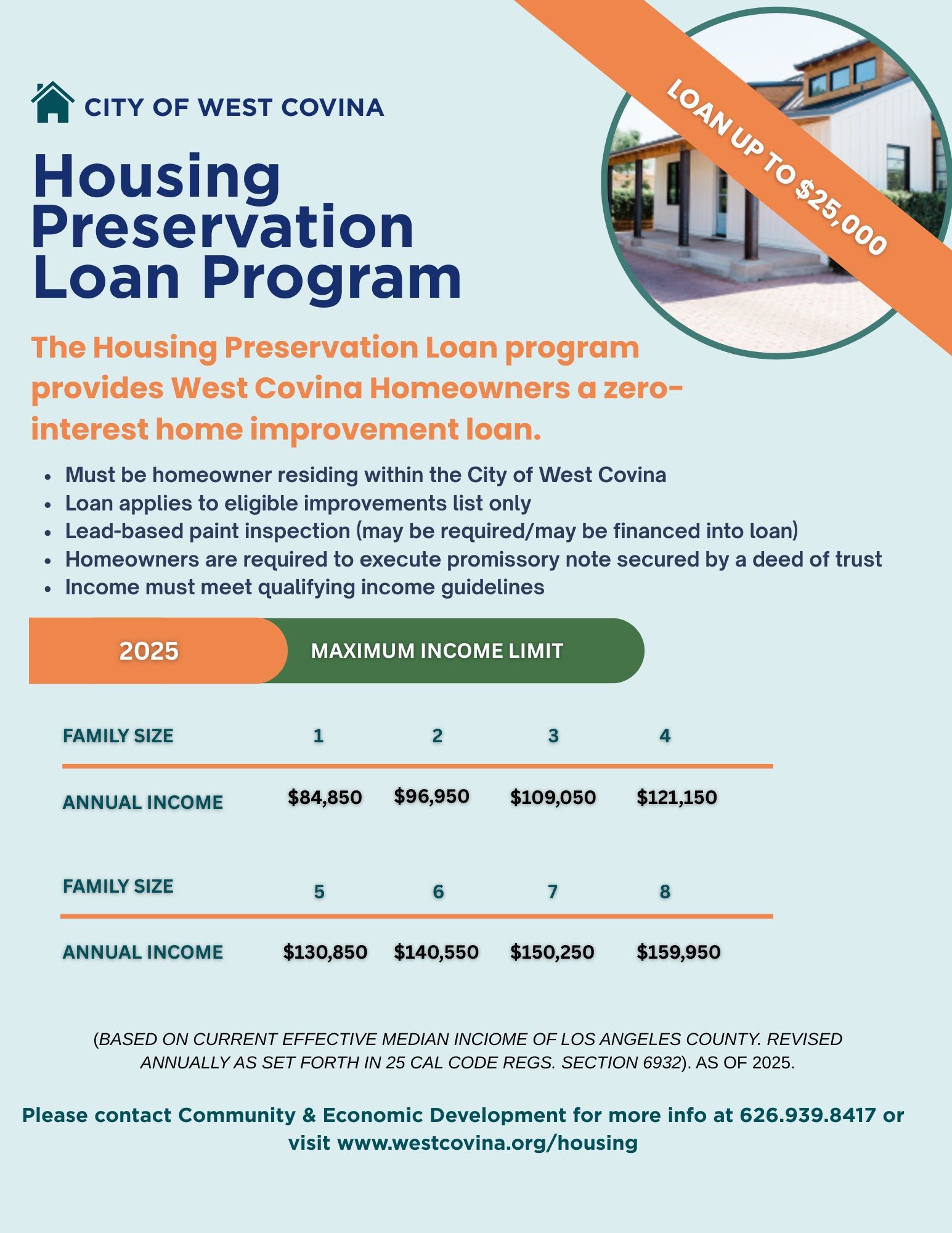 The Program will provide eligible, moderate-income West Covina homeowners a low-interest home improvement loan of up to $25,000. To be eligible, a single-family home must be the primary residence and the homeowner must have resided in the home for a minimum of twelve (12) months.